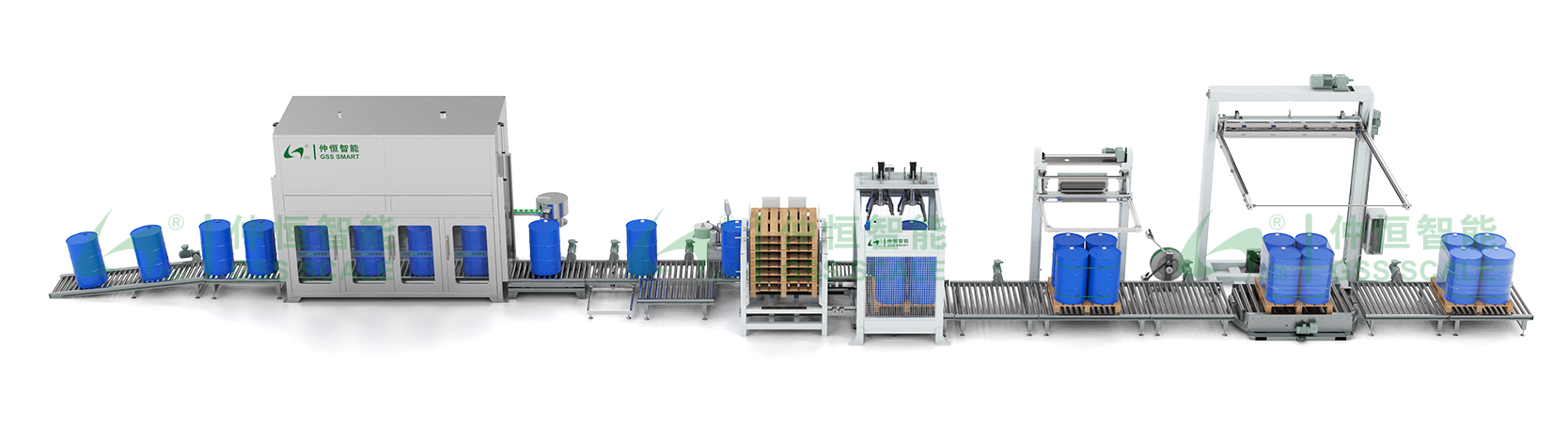 本線適用于200L桶自動(dòng)稱重計(jì)量灌裝,人工上桶,自動(dòng)進(jìn)桶,視覺(jué)尋口開(kāi)蓋,雙工位自動(dòng)灌裝,自動(dòng)旋蓋、壓防水蓋,自動(dòng)出桶,在線復(fù)檢及移栽剔除,自動(dòng)貼標(biāo),自動(dòng)碼垛,水平捆扎及自動(dòng)覆膜纏繞??蛇x擇直接對(duì)接空桶桶庫(kù),實(shí)現(xiàn)供、灌、存,智能化生產(chǎn)。