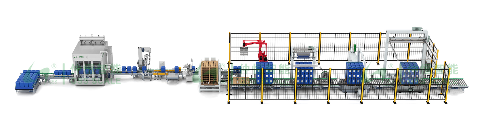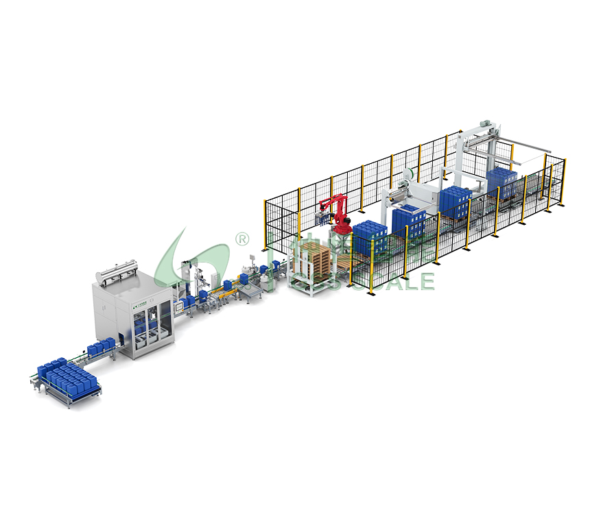 ■ 自動上桶補桶機,全自動稱重式灌裝機,自動理蓋旋蓋機,在線檢重及剔除機,自動貼標噴碼機,機器人碼垛,自動供棧機,水平捆扎機,穿劍捆扎機,自動覆頂膜纏繞機。